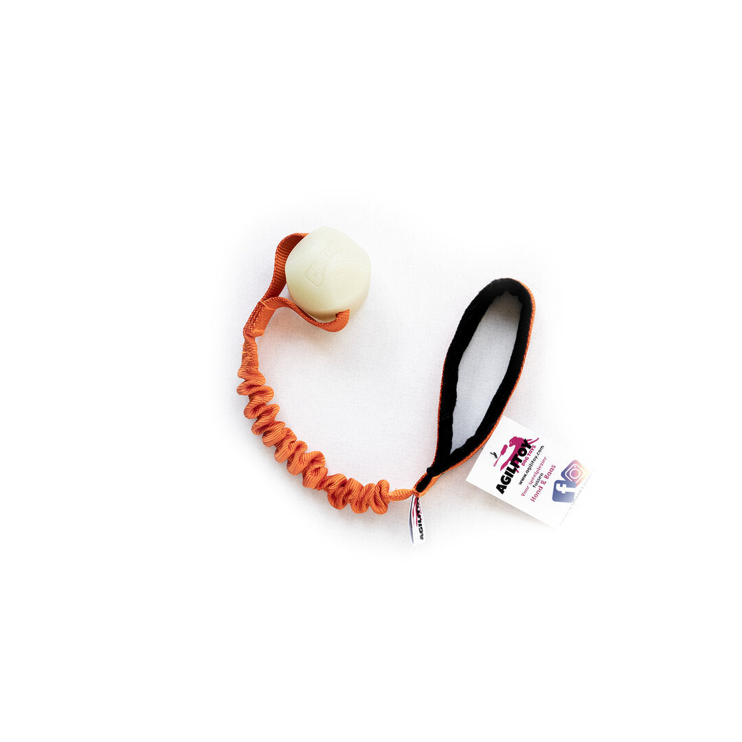 Deze Agilitoy heeft een handvat met bungee en een glow-in-the-dark bal aan het uiteinde. De binnenkant van het handvat bevat een voering van zacht fleece materiaal.