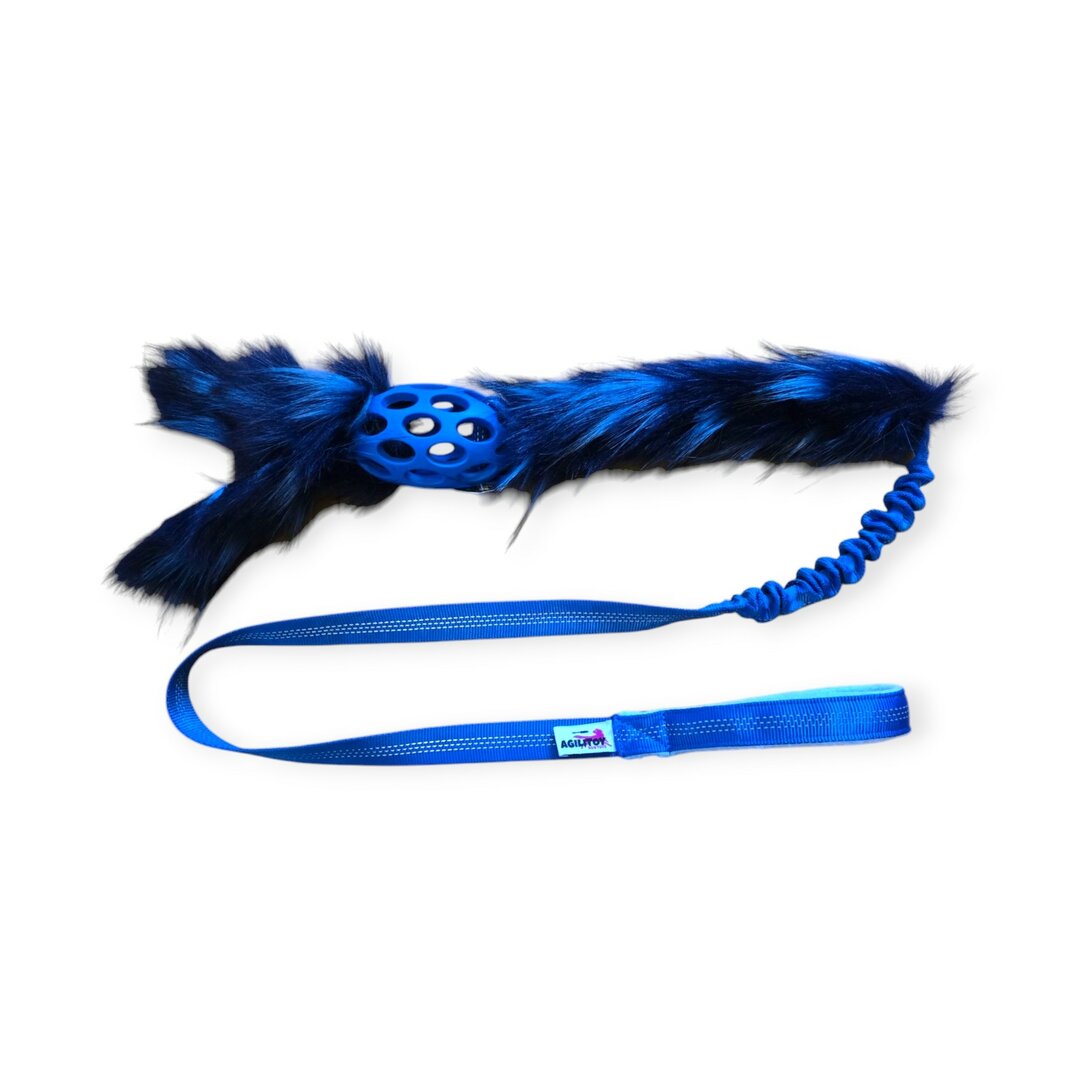 Lang hondenspeeltje (chaser tug) met bijtvlak uit imitatiebont, bungee gedeelte en eivormige bal.