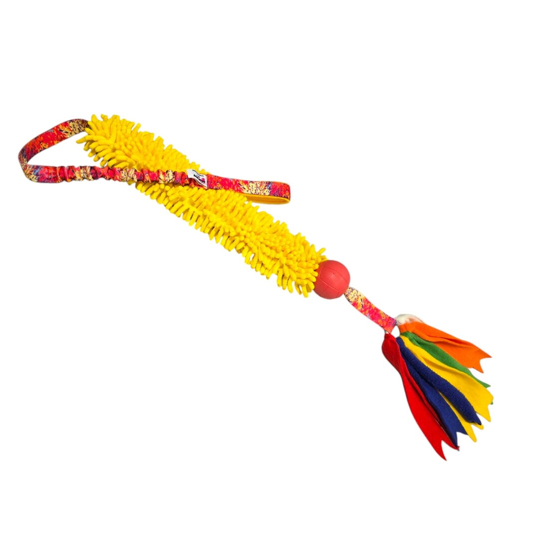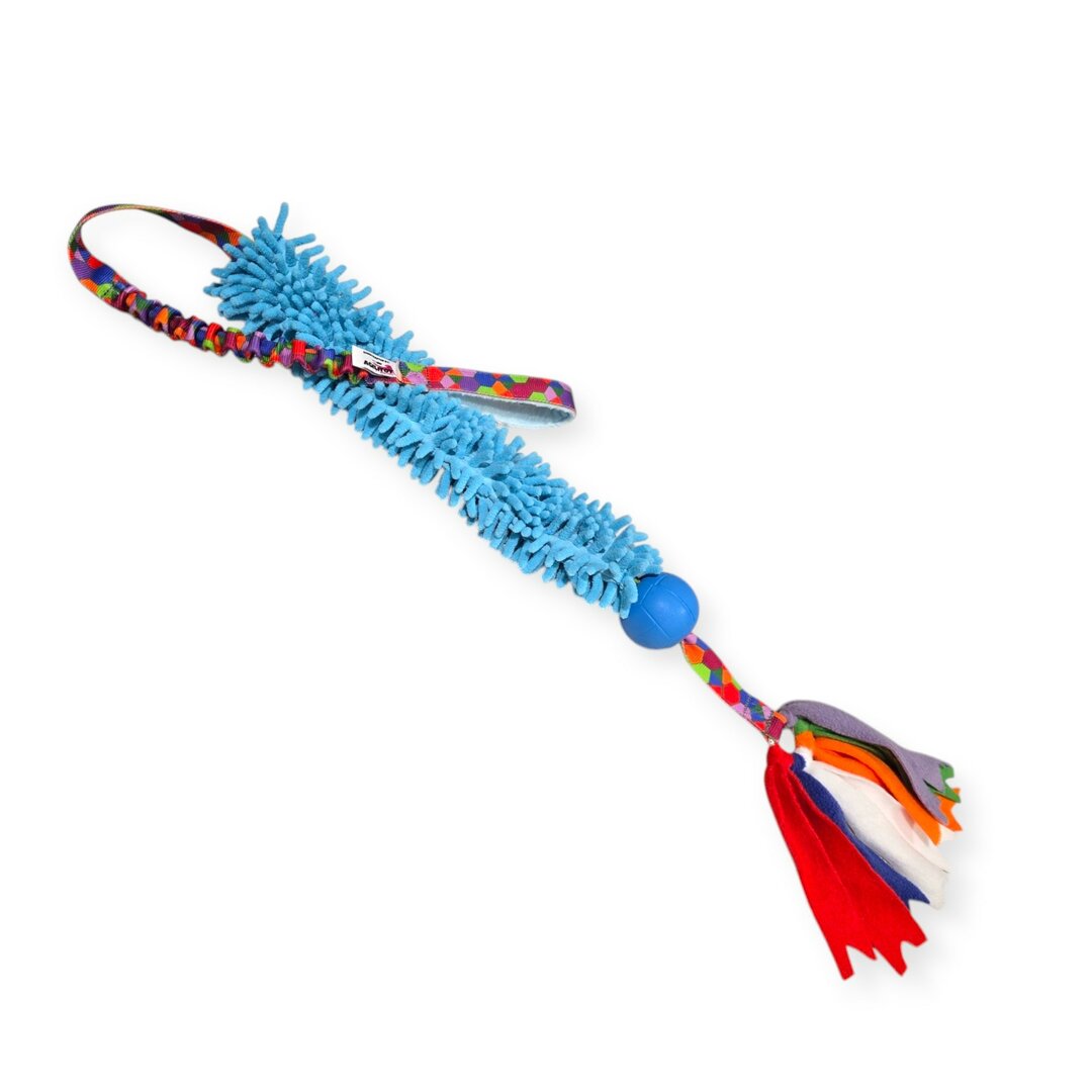 Hondenspeeltje met gekleurd bijtvlak van Microfiber waaronder een bal en meerdere slierten gekleurd fleece zijn bevestigd.