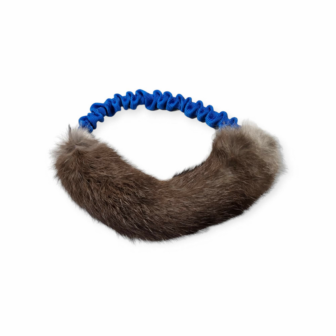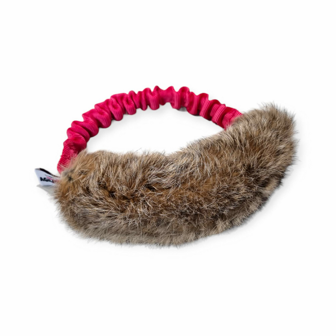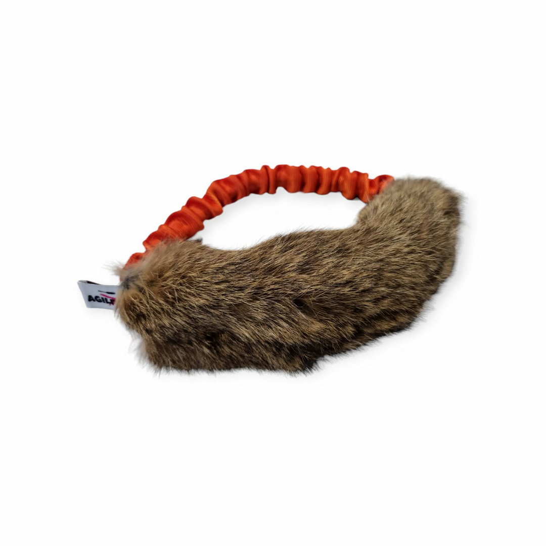 Deze Agilitoy heeft een rond handvat met bungee (elastisch) en een met konijnenvacht bekleed bijtgedeelte.