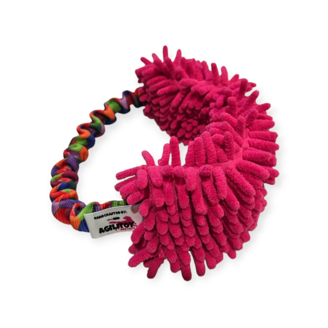 Hondenspeeltje met ringvormig handvat en bijtgedeelte uit gekleurd Microfiber. Handvat met elastisch gedeelte.