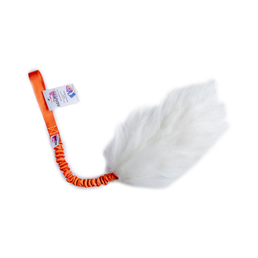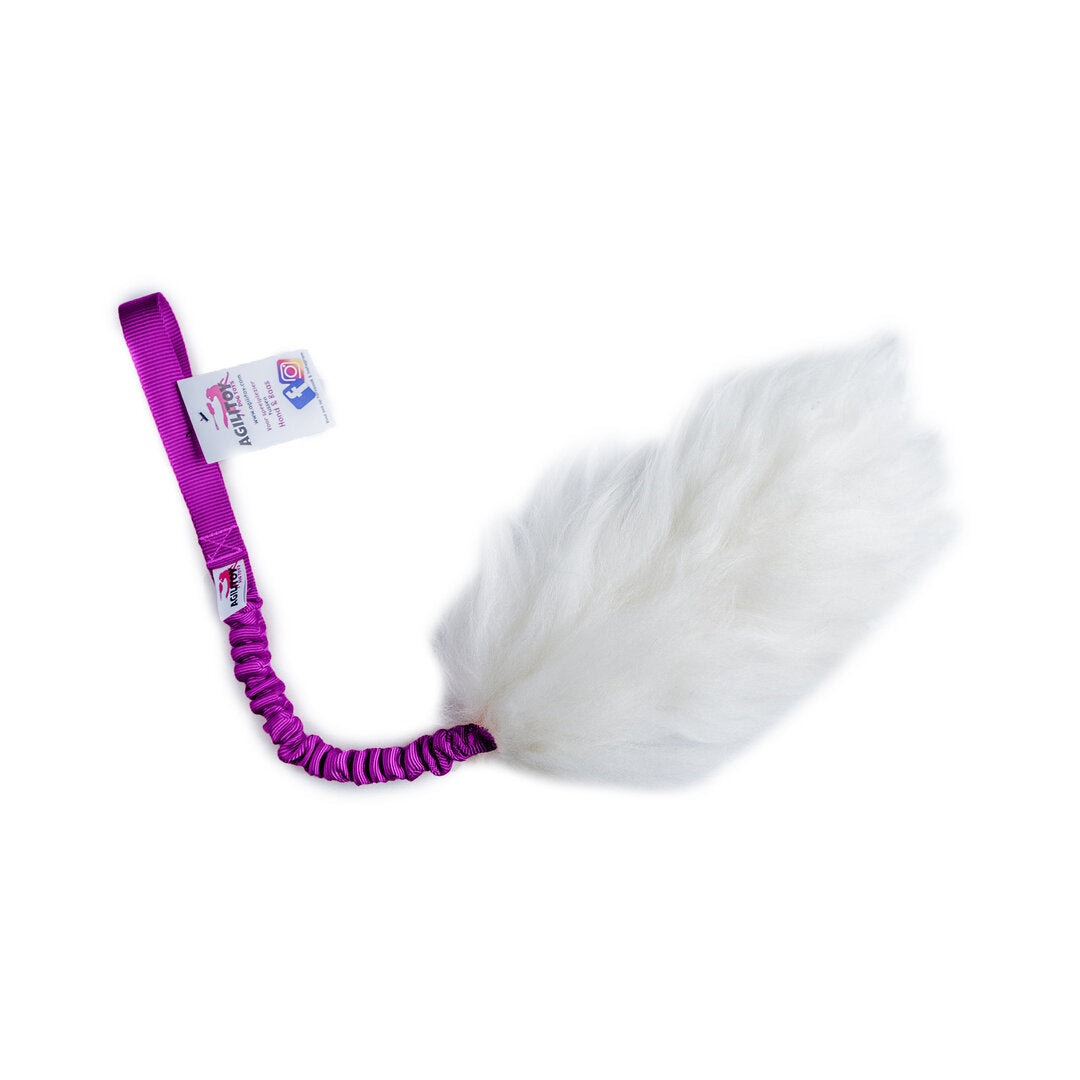 Deze Agilitoy heeft een bijtgedeelte bedekt met schapenvacht. Voorzien van een bungee (elastisch) handvat.