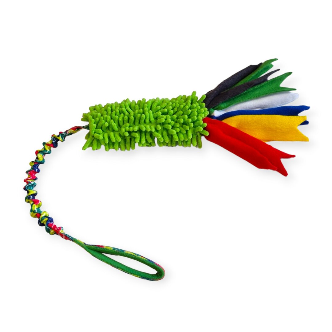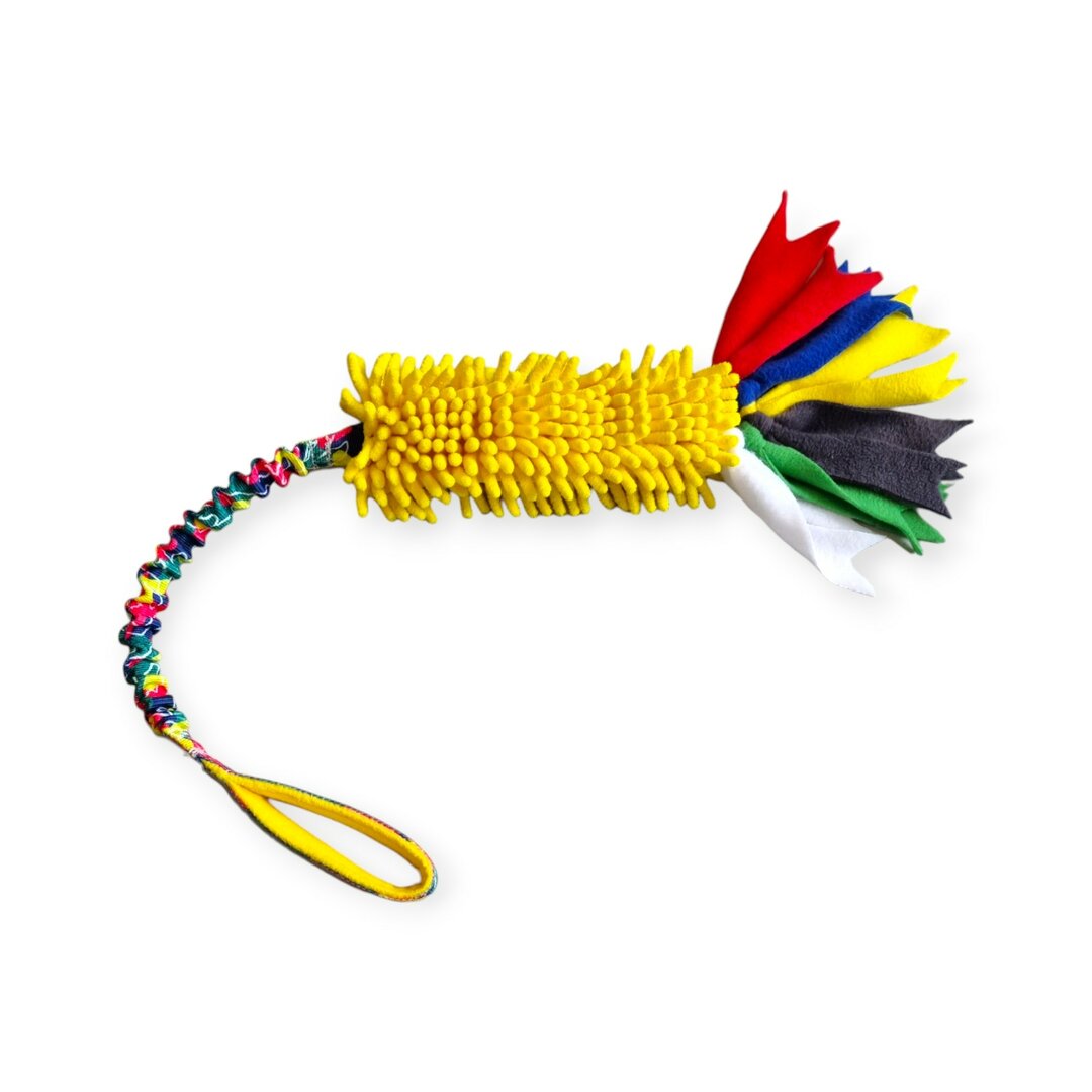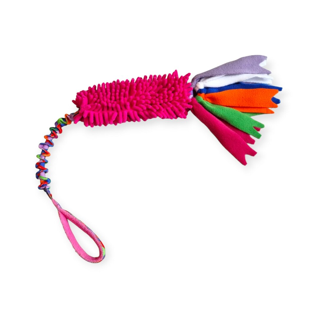 Hondenspeeltje met gekleurd Microfiber bijtvlak waaronder verschillende slierten gekleurde stof zijn bevestigd. Gevoerd handvat met elastisch gedeelte.