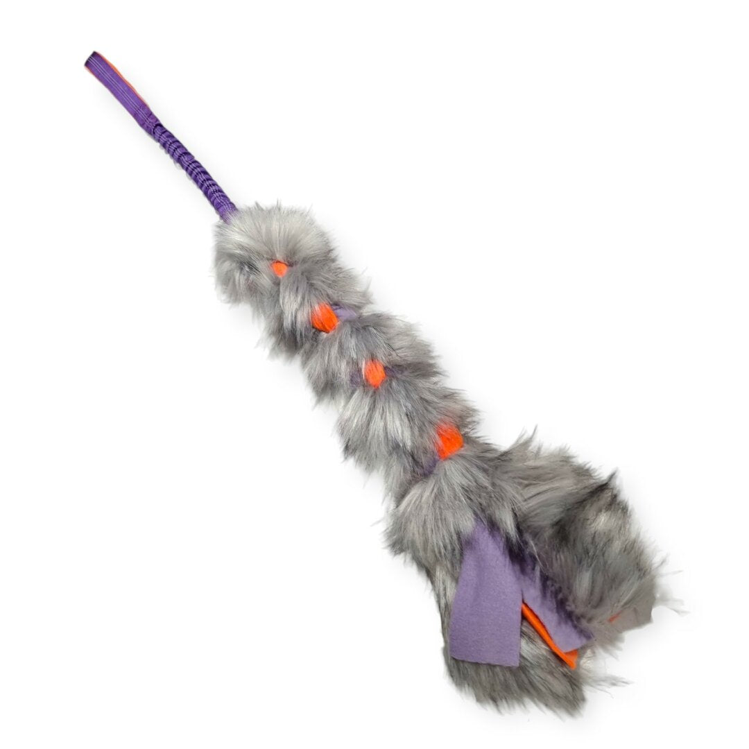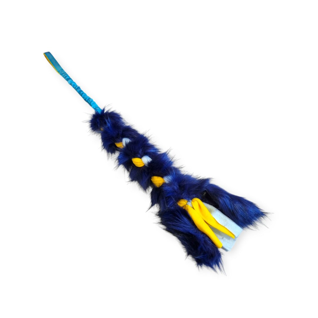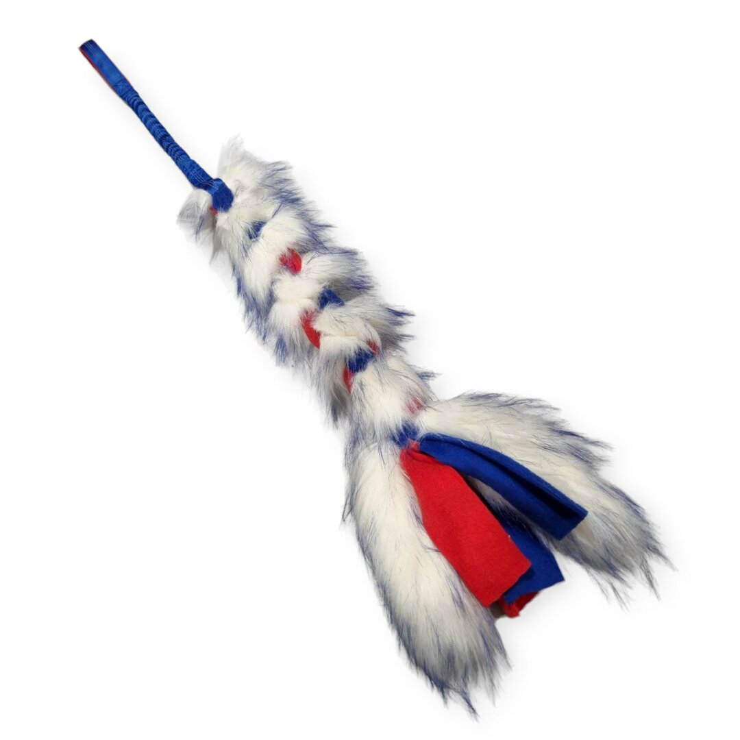 Hondenspeeltje met gekleurd bijtvlak van Microfiber waaronder een bal en meerdere slierten gekleurd fleece zijn bevestigd.