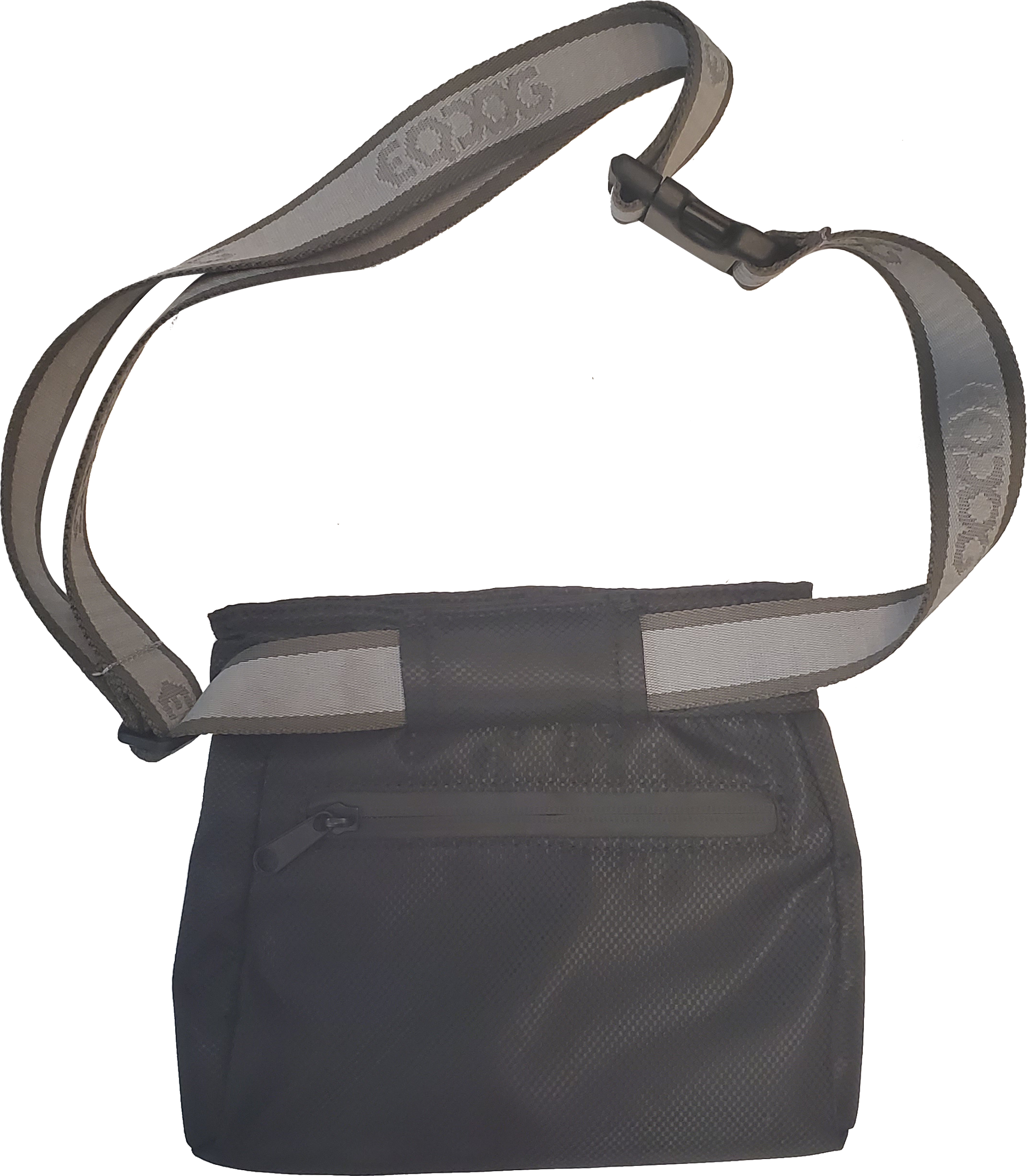 Click'n Treat™ wordt gedragen met een stevige, verstelbare riem met een klikgesp. De riem is ruim genoeg en kan tot 145 cm worden verlengd, zodat je het tasje over je jas kunt dragen. Slecht weer is nu geen excuus meer om niet met je hond te gaan spelen.