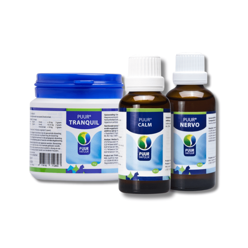 De basis van de vuurwerkbundel voor hond en kat wordt gevormd door PUUR Tranquil. Dit is een poedersupplement samengesteld met rustgevende kruiden en L-Tryptofaan. Dit is een aminozuur wat bijdraagt aan de aanmaak van serotonine, een neurotransmitter die zorgt voor een kalm en tevreden gevoel. Met PUUR Tranquil begin je zo vroeg mogelijk, bij voorkeur uiterlijk 1 december.